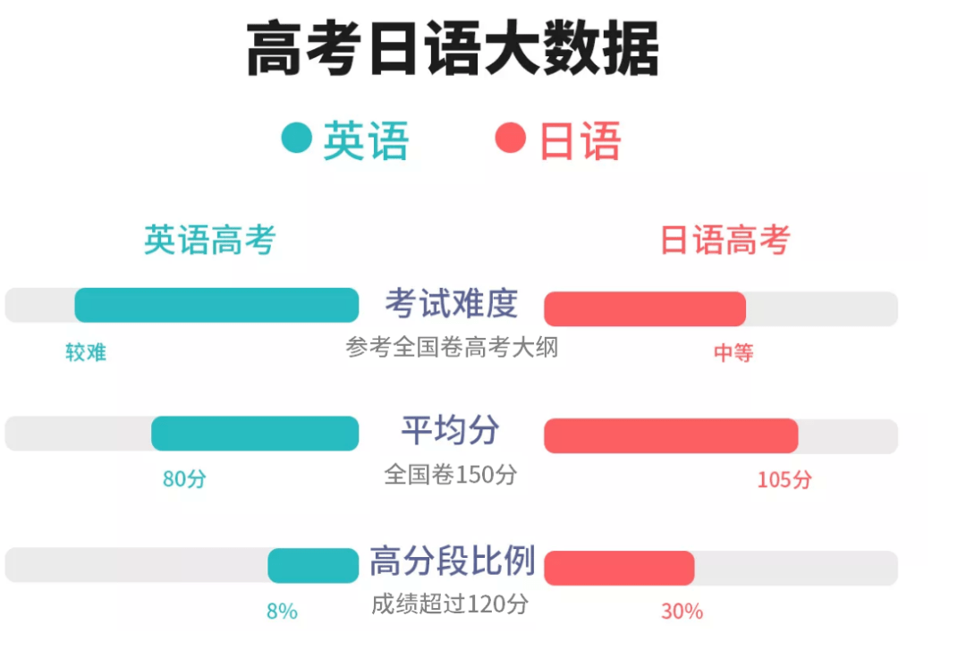 此外,日语高考只需要掌握2500个日语单词,而英语高考词汇量在3500个左右。除去这30%-40%的中文汉字,用日语参加高考的学生所要记的单词远远低于英语考生。