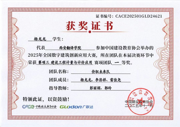 近日,2025年全国数字建筑创新应用大赛圆满收官。在这场汇聚全国近500所院校、3100支团队的激烈角逐中,西安翻译学院学子凭借硬核实力,一举斩获国家级一等奖1项、二等奖2项、三等奖5项。其中,由信息工程学院工程管理系杨龙龙、李济祥、雷佳尧三名学生在彭丽娟、郭玲两位老师指导下组建的“价驭未来队”荣获国赛一等奖,更是凭借出色表现跻身全国12强,不仅刷新了学校在该项赛事的历史成绩,更实现了获奖数量与质量的双重飞跃,标志着学校在数字建筑领域的教学与实践水平迈上新台阶。