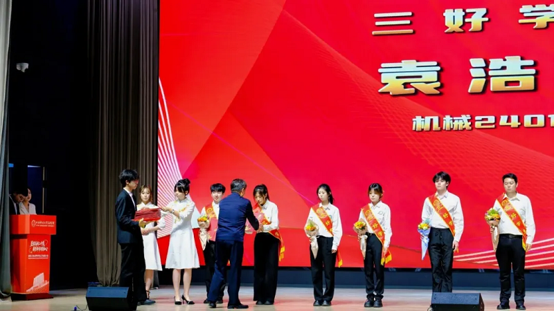 在庄严的国歌声中,大会正式拉开帷幕。一段震撼人心的开场视频,带领全场师生回顾过去一年的奋斗历程,凝聚起奋进新征程的强大力量。大会分三大篇章开展表彰工作,树立先进典型,传递榜样力量。第一篇章聚焦学业优异、奋发向上的学生榜样,集中颁发各类学生奖学金:30名同学获“国家奖学金”,367名同学获“国家励志奖学金”,18名同学获“筑梦奖学金”,970名同学获“校级奖学金”。获奖学生代表依次登台领奖,手中的证书既是对过往努力的肯定,更是对未来前行的承诺,生动诠释了“勤奋”与“自律”的深刻内涵。